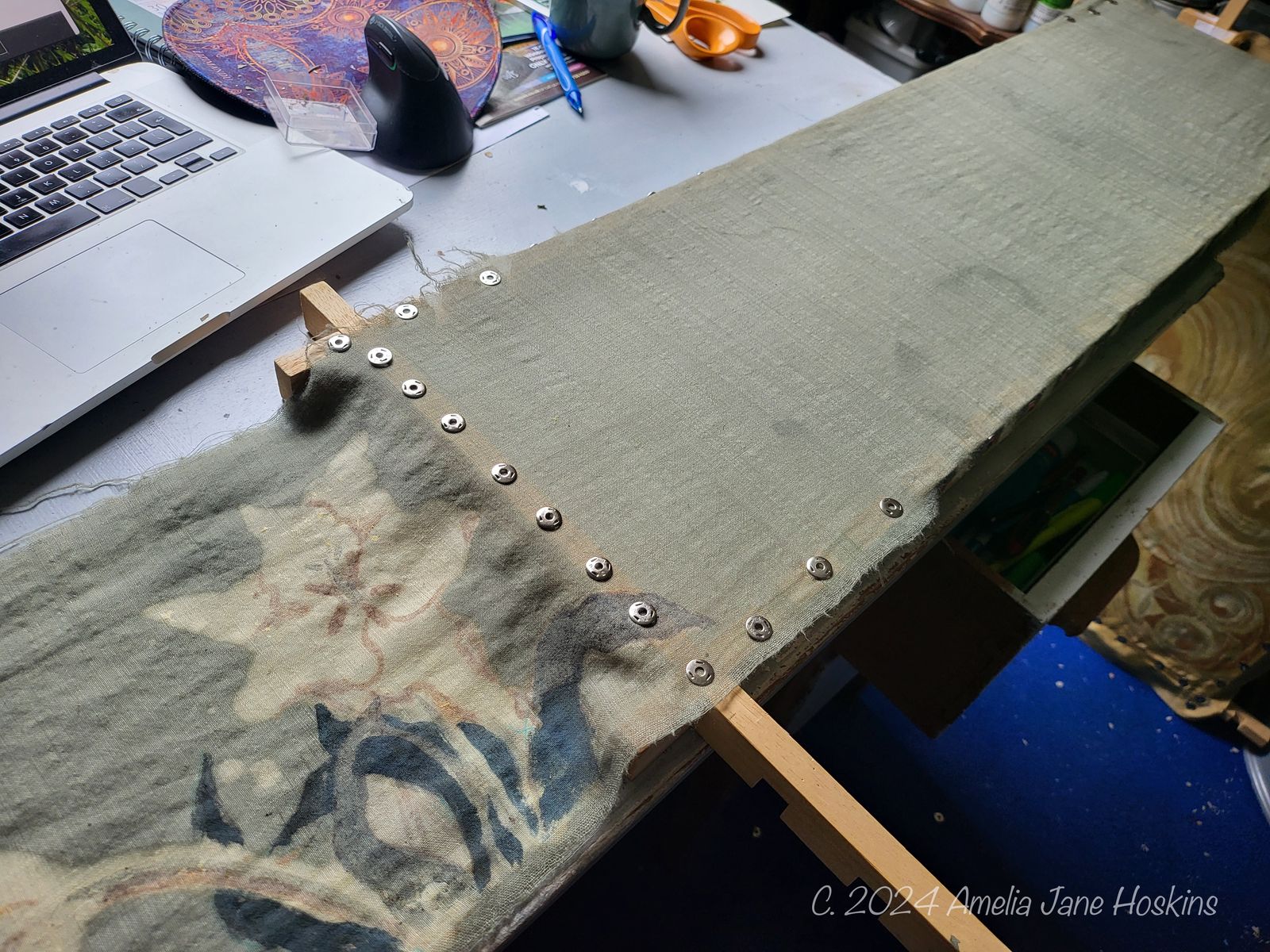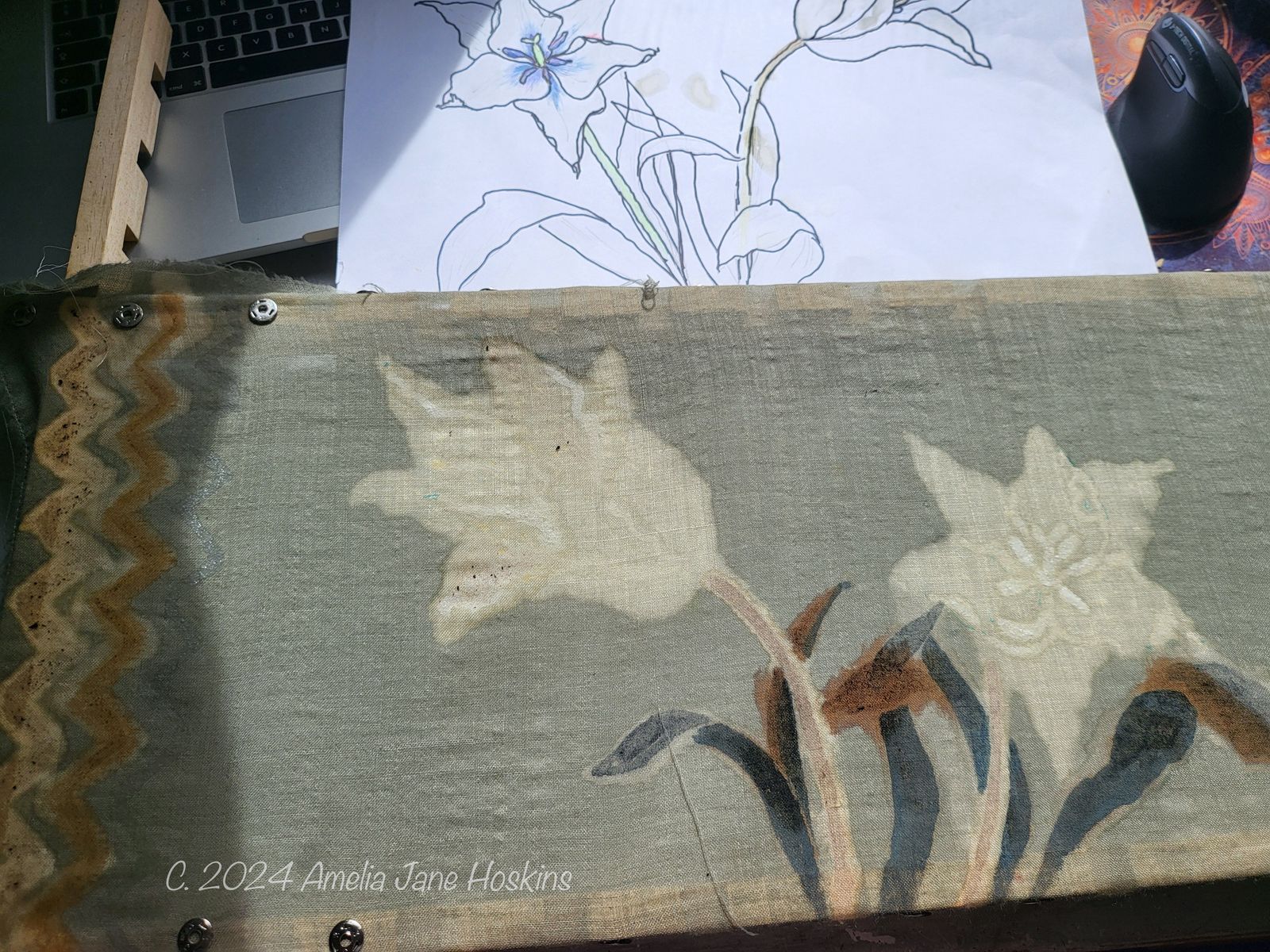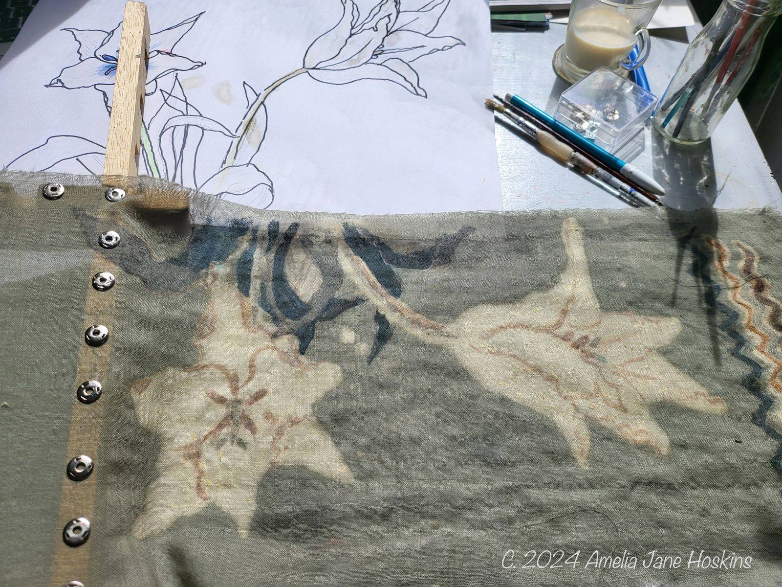 Sequence of painting on fine wool with natural dyes, then change of appearance after steaming.