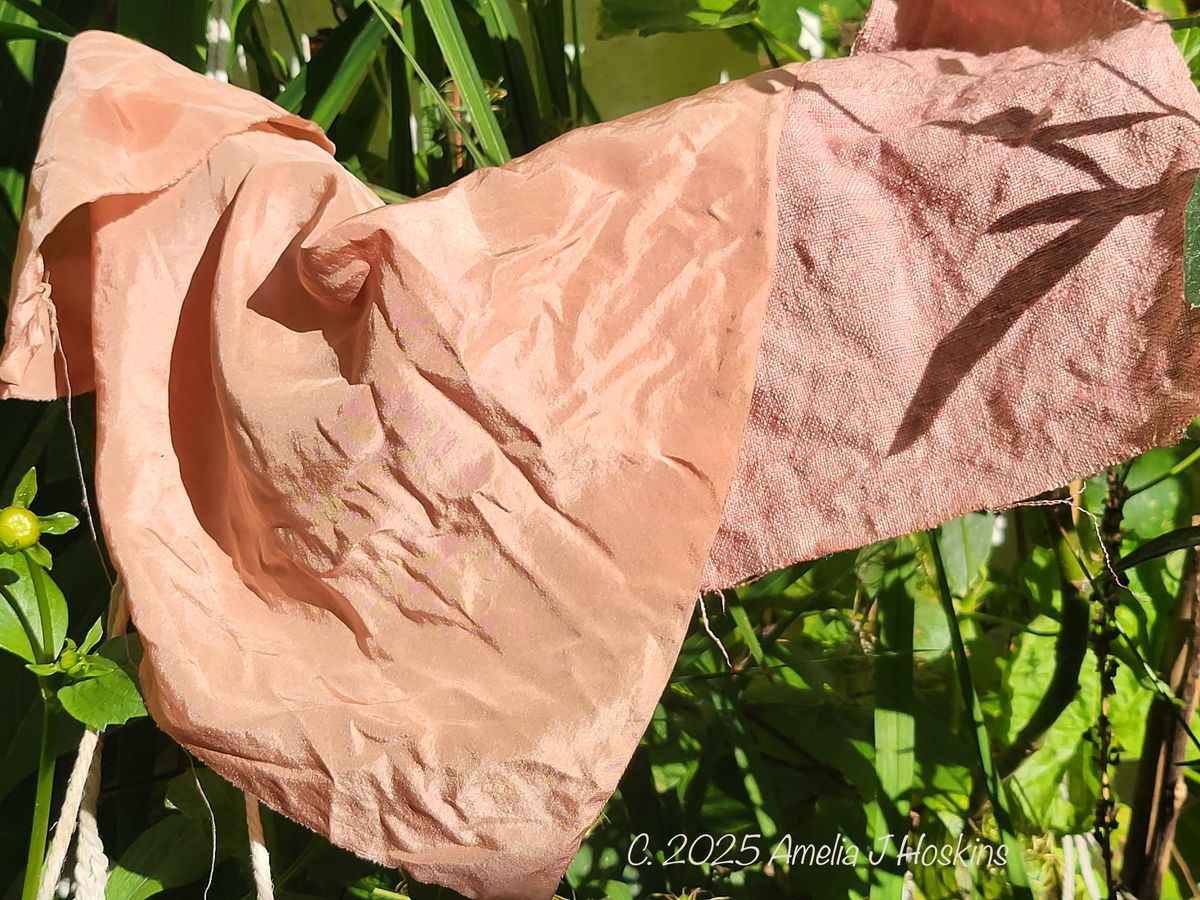 They start red, but these were picked when russet, in October.  Soak flowers in water until dye appears. I leave these for a few weeks before adding fabric.  Silks Habotai and Erin were soaked for a few days amongst the flower seeds.